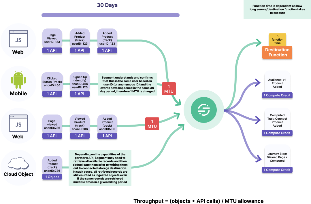 Object Cloud Sources retrieve records from integration partners on a scheduled basis. Segment processes these records before writing them out to connected Storage Destinations. Segment counts one object for each record retrieved from a Cloud Source. The number of objects ingested during a billing period has a direct impact on throughput, which is calculated as (objects ingested + API calls received) / MTU allowance